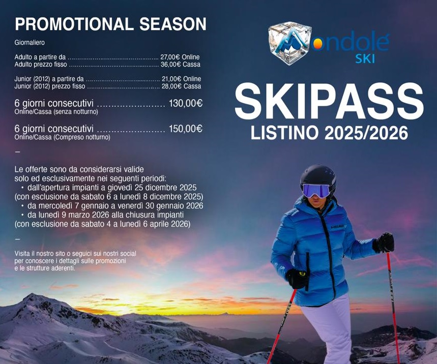 Dal 9 marzo fino a fine stagione torna la Promotional Season di Mondoleski che offre giornaliero adulto online a partire da 27,00 euro e giornaliero in biglietteria a 36,00 euro (martedì, mercoledì e giovedì) e la possibilità di trascorrere 6 giorni consecutivi sulle nostre piste con skipass adulto a soli 130,00 euro.